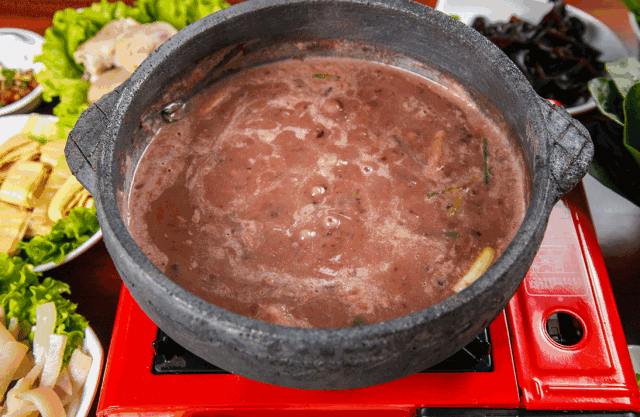 用豆米熬制的汤底,清香四溢,浓稠美味,豆米在汤里熬得软软的,口感层次丰富。各色蔬菜煮在豆米火锅中,味道显得清新透亮且微甜。