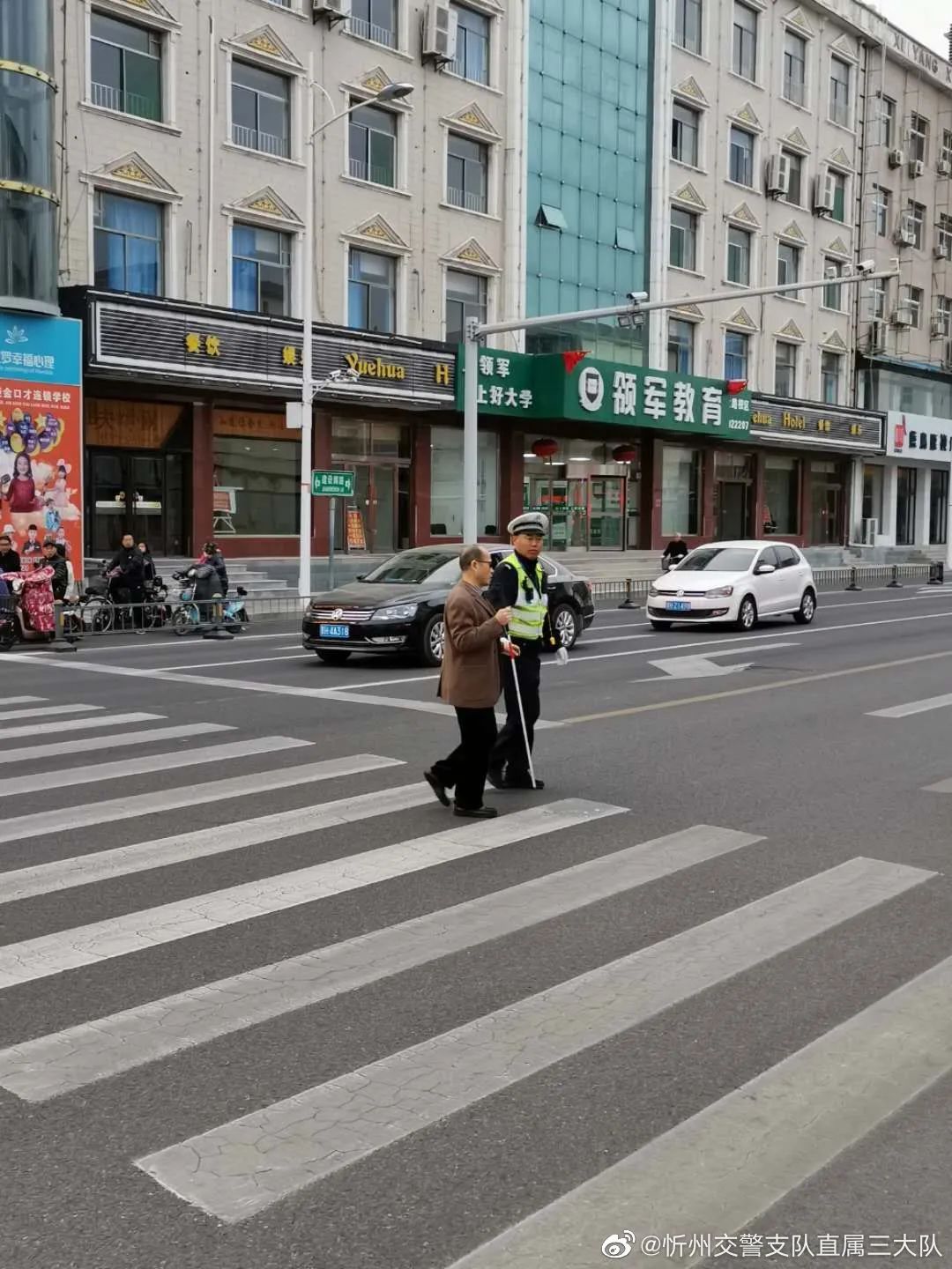 2020 年10月28 日,忻州交警在辖区利民岗进行交通违法行为查处时,发现一视力障碍人士正在尝试通过马路,但无法准确分析车流通过情况。警员见状,便主动上前询问其是否需要帮助,目的地是何处。在得知相关信息后小心搀扶通过红绿灯口,并示意右转车辆避让,待将其平安护送至对面盲道后再度重返工作岗位,认真负责疏导路口交通秩序,开展交通违法行为查处工作。
