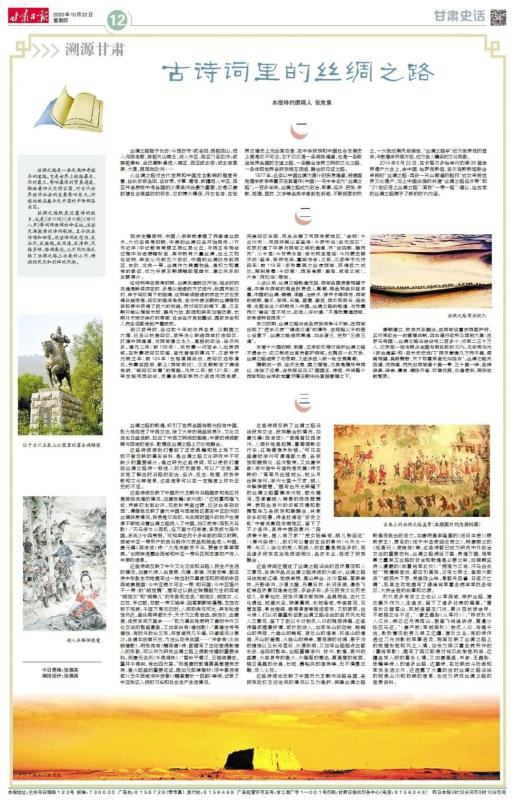 丝绸之路既是边塞诗的故乡,也是《凉州词》《凉州歌》《甘州八声》等词牌曲牌的命名地。这些充满激情的诗词歌赋,至今犹在传唱和回荡。这些诗词或悲伤,或壮烈,或激越,或闲适,或清新,风格多样,格调高迈,从不同侧面反映了丝绸之路上壮美的山河、旖旎的风光和别样的风物。