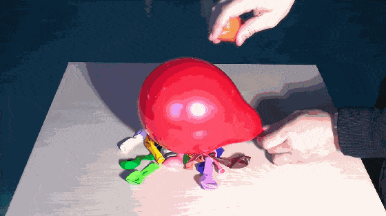 实验开始,再次吹起气球,消防员首先将完整的橘子皮剥落,然后用力挤出橘子皮里的汁液,当两三滴汁液与气球接触后,气球瞬间爆炸。柚子、柠檬、西柚、金橘等柑橘类水果的果皮,也用同样的方法尝试做了实验后,发现气球均被汁液“完爆”。