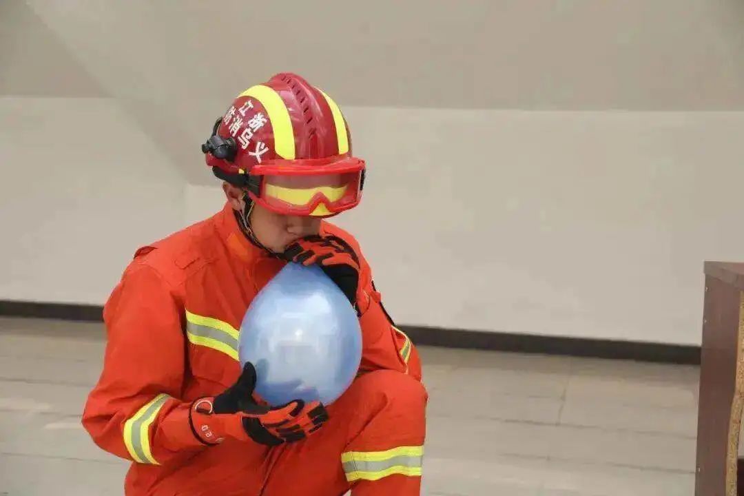 为了避免气球爆炸误伤消防员,参与实验的两名消防员都穿好了防护服,戴好护目镜。随后,消防员用嘴吹起了一个气球,气球体积类似排球大小。