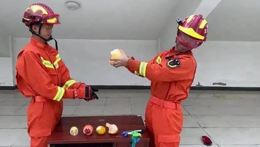 紧接着,另一名消防员拿来一个橘子这个橘子可以一只手握住