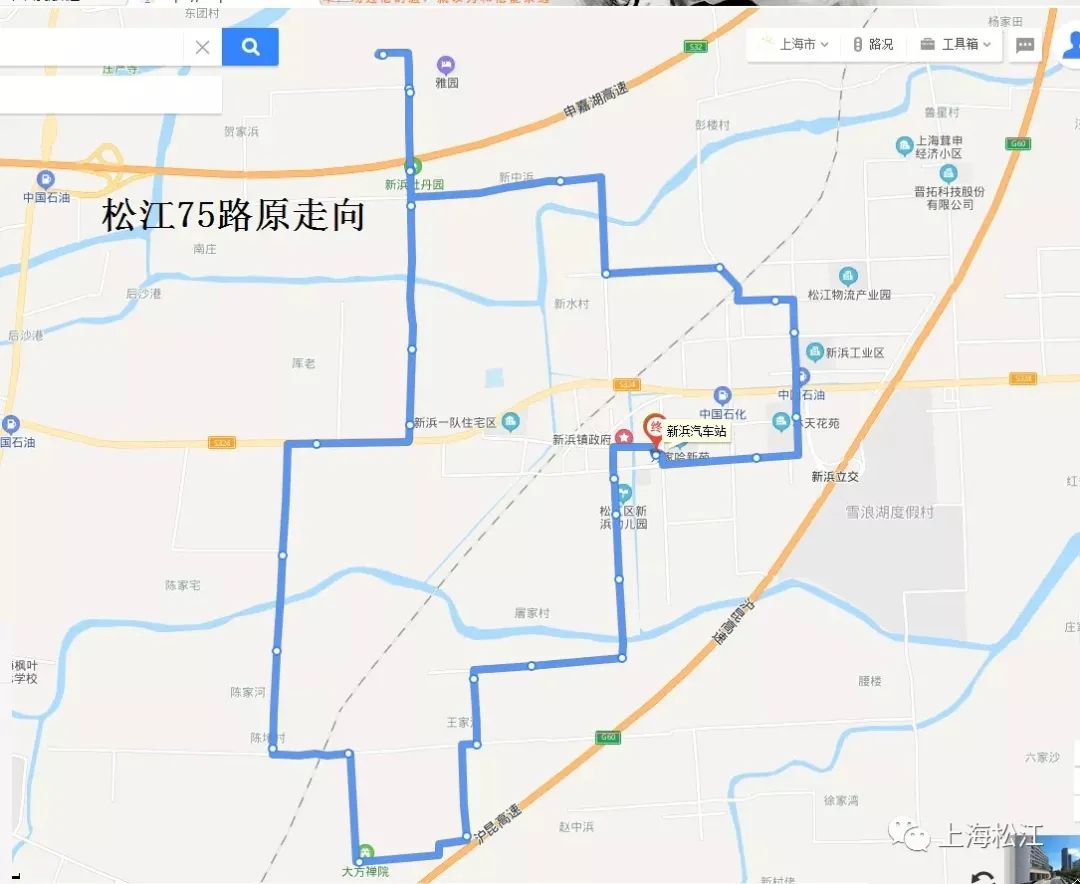 松江75路原走向:自新浜汽车站起经新颖路、新绿街、共青路、林赵路、赵王路、香长路、林香路、钱家草路、大方路、香长路、白陈路、叶新公路、许村路、中南路、黄家埭路、彭中路、新彭路、林天路、新工路、新绿街、新颖路至新浜汽车站。(单向)