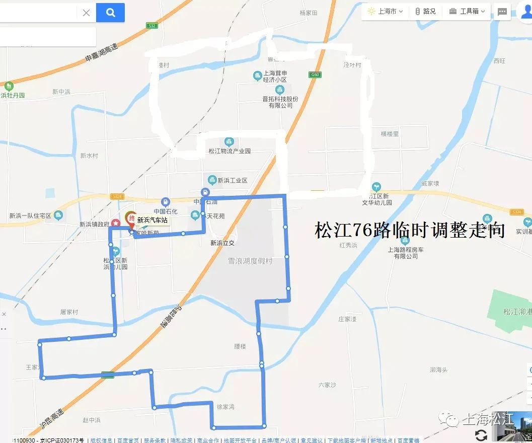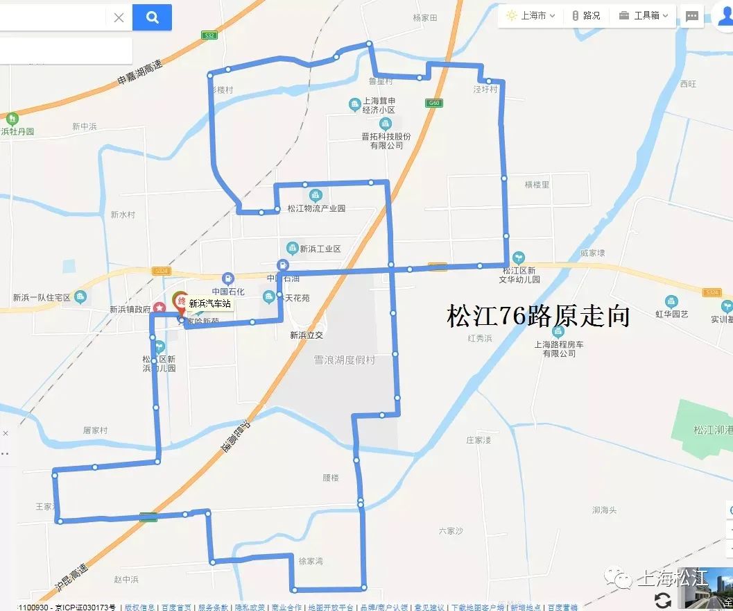 松江76路原走向:自新浜汽车站起经新颖路、新绿街、共青路、林赵路、赵王路、香长公路、三秀路、曹西路、胡曹路、叶新公路、文工路、泾甪路、胡甪路、甪彭路、新彭路、林天路、新工北路、上虞路、胡甪路、叶新公路、新工南路、新绿街、新颖路至新浜汽车站。(单向)
