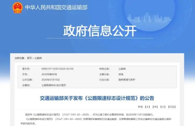 对此,交通运输部在近日发布了《公路限速标志设计规范》公告,将进一步规范全国限速标志设计,自2020年11月1日起施行,大量不合理的限速标志将会面临拆除。