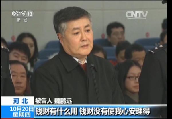 2015年12月,魏鹏远受贿、巨额财产来源不明案一审开庭。 新华社 资料图家藏现金2亿多,点钞机当场烧坏