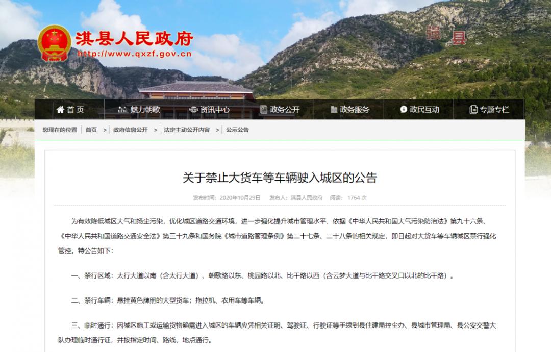 近日,鹤报融媒体记者从淇县人民政府网站了解到,为有效降低城区大气和扬尘污染,优化城区道路交通环境,进一步强化提升城市管理水平,11月1日起,禁止大货车等车辆驶入淇县城区。