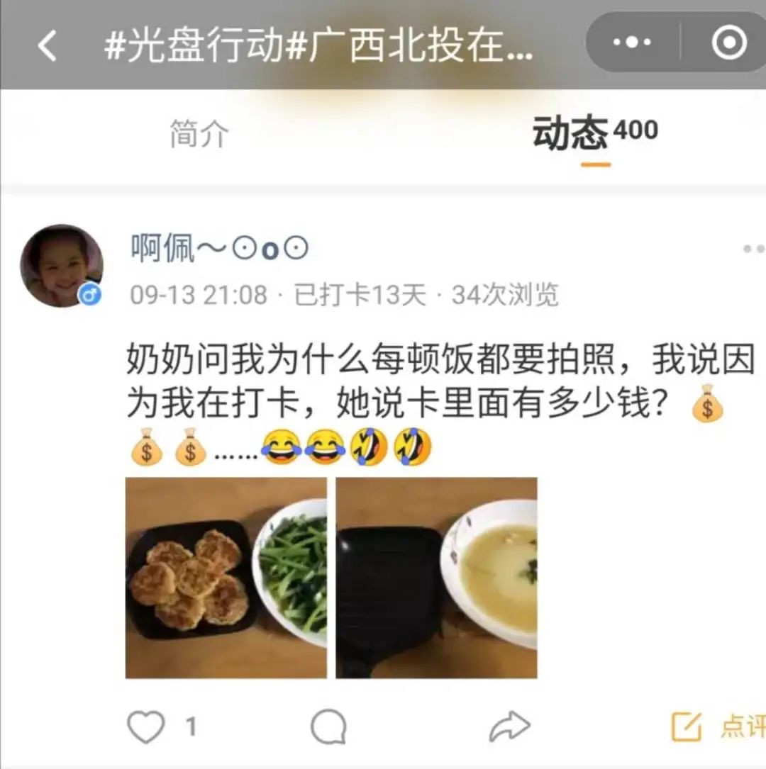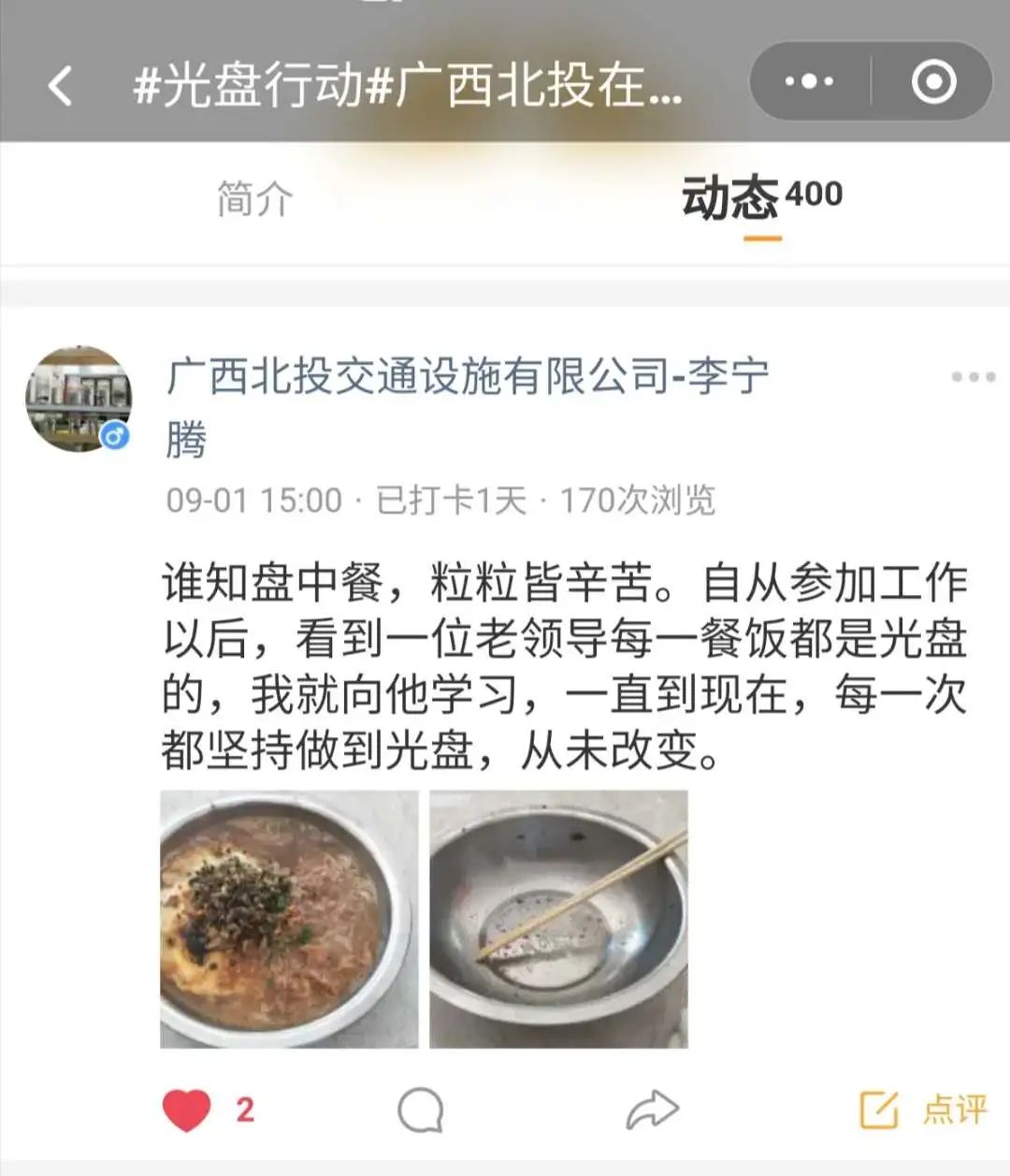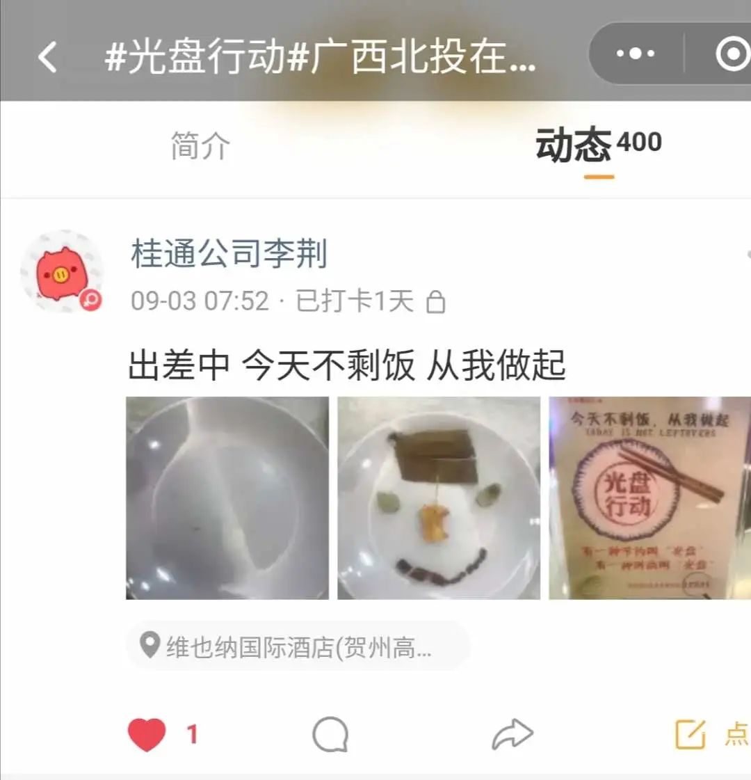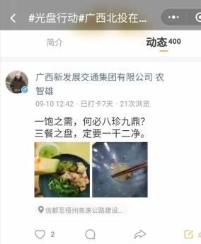 9月1日至9月22日,广西北投集团在微信小程序发起“#光盘行动#广西北投在行动”线上活动。活动期间,广大员工踊跃参与,晒出每天的“光盘”照。