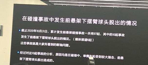 刘杰:其实每起事故的撞击部位、撞击速度和撞击的物体都不一样,新的50KN下摆臂球销在同级别车型中已经属于中上等水平。