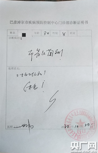 但仍有乏力、关节疼痛症状的许先生放心不下,今年10月前往内蒙古巴彦淖尔市疾控中心门诊部检查,10月20日,许先生的诊断结果出来了,和兰州肺科医院的检测结果不同,他还是“双阳性”,在诊断书上记者看到:巴彦淖尔疾控中心门诊部医生罗建场,诊断许先生患有布鲁氏菌病,处理意见为休息、对症服药。