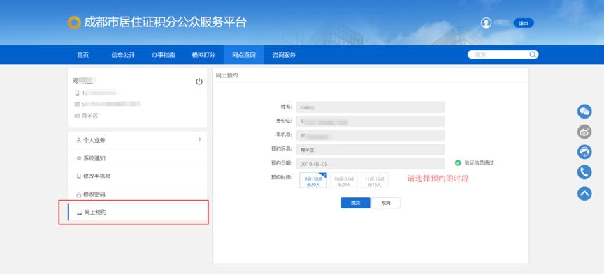 二、点击“网上预约”,选择预约日期和预约时段,点击提交。