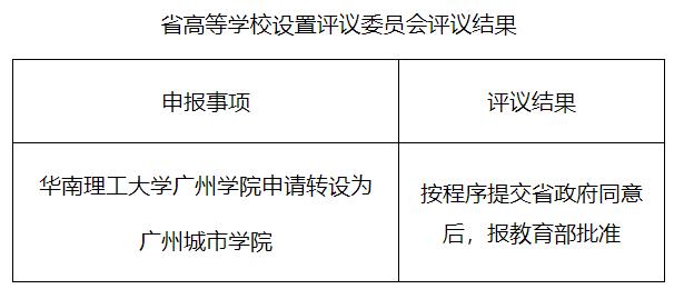 11月2日,广东省教育厅发布《关于省高等学校设置评议委员会评议结果》,公示华南理工大学广州学院拟转设为广州城市学院。