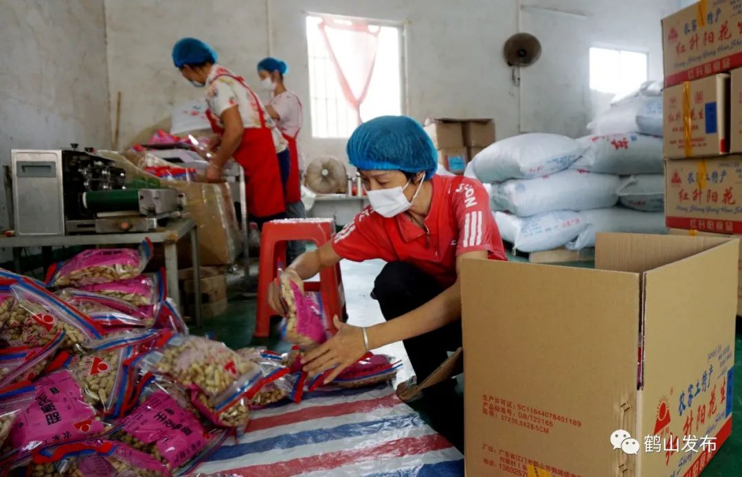 在南星鸡仔地村里的一家花生加工厂内,村民廖阿姨正在一堆刚加工好的花生里挑拣着品相不好的花生,然后把挑拣好的花生装袋。在厂里工作了4年,朝八晚五,收入稳定,从无所事事的家庭主妇到拥有一份工作,五十几岁的廖阿姨对现状十分满足。“厂招聘我们进来工作,对于我们这种年龄的人来说挺好的,时间比较自由,收入也可以,可以帮补家里,可以改善家里的生活环境。我们在这里做都很开心,像个大家庭一样。”