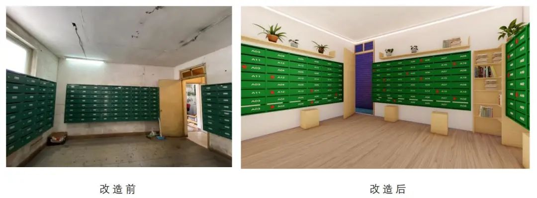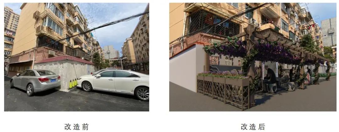 设计方案中除了保留居民信箱之外,还新增了休闲座椅和景观花架,可以让居民放置一些花卉绿植,并摆放一些图书共享给楼组居民。“紫藤花下的邂逅”