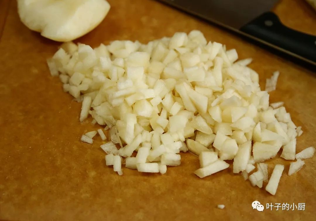雪梨一定要切得碎一些,切大块了味道不容易融合,做出来口感差,尤其是孩子吃的话建议切得越小越好。