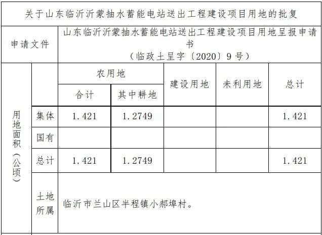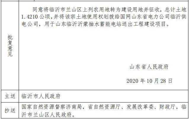 批复意见:同意将临沂市兰山区上列农用地转为建设用地并征收,总计土地1.4210 公顷,并将该宗土地使用权划拨给国网山东省电力公司临沂供电公司,用于山东临沂沂蒙抽水蓄能电站送出工程建设项目。