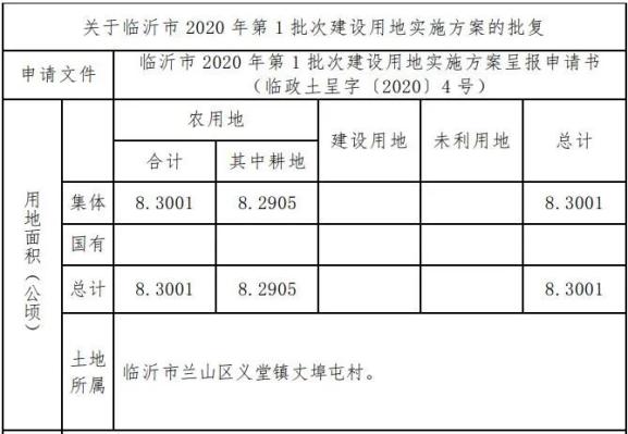 批复意见:根据《自然资源部关于济南市等 9 市 2019 年度农用地转用和土地征收方案的批复》(自然资函〔2019〕654 号),同意临沂市上报的农用地转用实施方案,总计土地 8.3001 公顷。