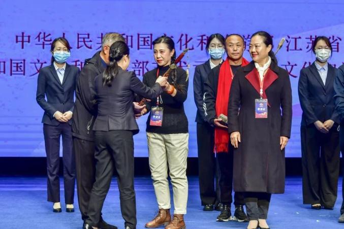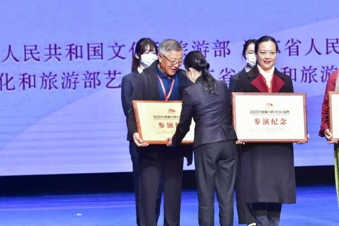 山东5家演出单位捐赠了乐器、戏服等53件物品,76岁高龄的“蓝关戏”省级传承人季祥林先生代表莱州捐赠了8件精美藏品。昆山市副市长代表昆山接受捐赠,并为演出团队颁发了“参演纪念牌”。