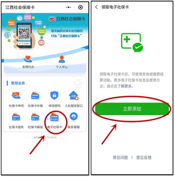 二、进入“江西社会保障卡小程序”首页,点击进入电子社保卡。进入领取电子社保卡页面,点击立即添加。