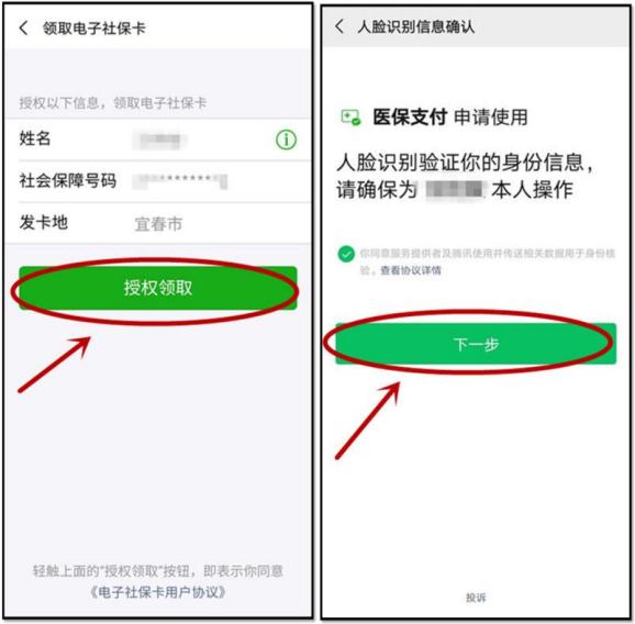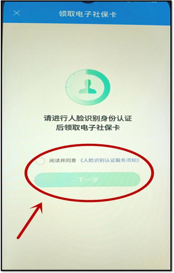 三、授权领取电子社保卡进入人脸识别信息确认页面,并勾选“协议”,点击下一步。