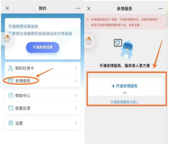 二、点击亲情服务,页面跳转后再点击“+开通亲情服务”。