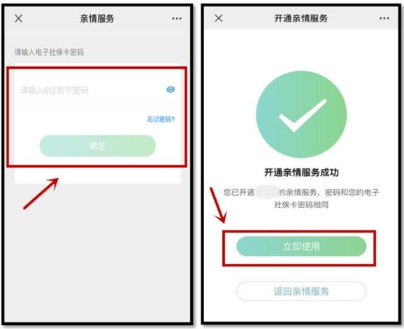 四、输入电子社保卡密码例:如张三为其母申请,此处需输入张三的电子社保卡密码;开通亲情服务成功后,点击立即使用,即可进入被绑定家人电子社保卡详情页面。