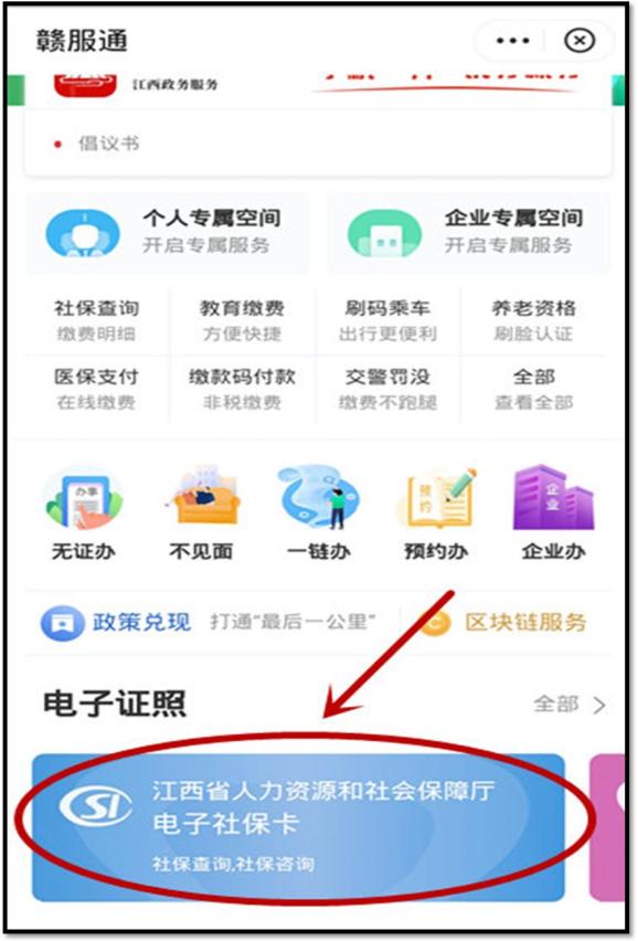 二、进入赣服通页面,找到电子证件,找到“江西省人力资源和社会保障厅电子社保卡”图标。