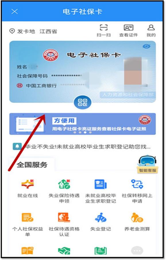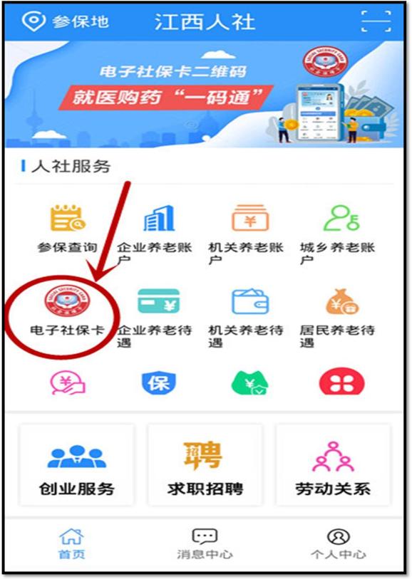 一、注册并登录“江西人社APP”,打开首页,点击电子社保卡图标。