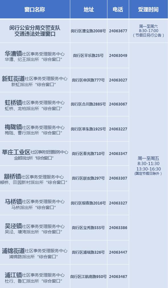 为进一步方便群众处理交通违法,自11月16日起,闵行公安分局将在七宝镇、莘庄镇、江川路街道三个社区事务受理服务中心的派出所“综合窗口”增设交通违法处理业务,闵行公安分局交通违法处理点将达到14个。No.1