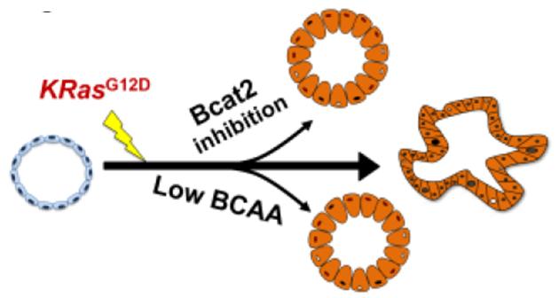 图二:癌基因Kras突变驱动支链氨基酸转氨酶2-支链氨基酸代谢轴促进胰腺癌的发生、发展。KRasG12D: 癌基因Kras G12D基因突变;Bcat2:支链氨基酸转氨酶2;BCAA:支链氨基酸