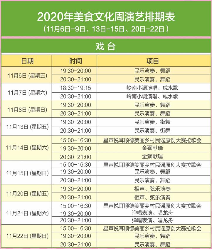今年的顺德美食文化周从以往的连续7天调整为9天,分别在11月6日至8日、13日至15日、20日至22日三个周末举行,打造15年来时间最长的美食盛宴。