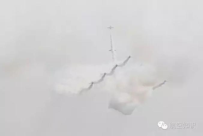 英国“红箭”飞行表演队进行的2机与7机对冲穿插动作。