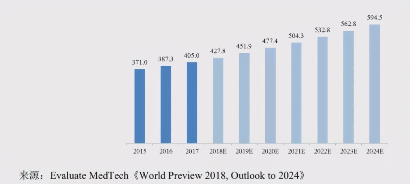从全球范围看,当下的医疗器械行业无疑是一个黄金赛道,国内市场也正迎来黄金十年。EvaluateMedTech数据显示,2018年全球医疗器械市场容量约为4,278亿美元,2017-2024年行业增速约为5.6%。由此计算,2024年全球医疗器械市场规模将达到5,945亿美元,按人民币计算将超过4万亿元。