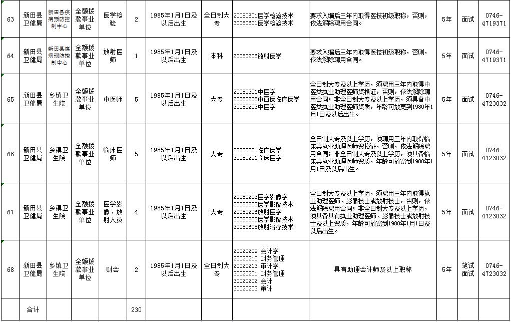 本次公开招聘医疗卫生急需紧缺人才共230人,其中人民医院105人,中医院98人,疾控中心5人,妇计中心6人,乡镇卫生院16人。具体情况详见《新田县2020年医疗卫生急需紧缺人才公开招聘职位表》(附件一)。