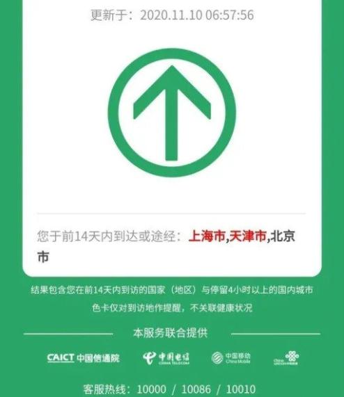 11月10日起,行程卡将对包含中高风险区域的地市名称标记为红色,仅作出行提示,不关联健康状况,具体政策请遵循各地联防联控机制。截止11月10日10:00,标记提示的地区有:新疆维吾尔自治区喀什地区、天津市、上海市。◆ 天津东疆港发现1例无症状感染者 系冷链搬运工