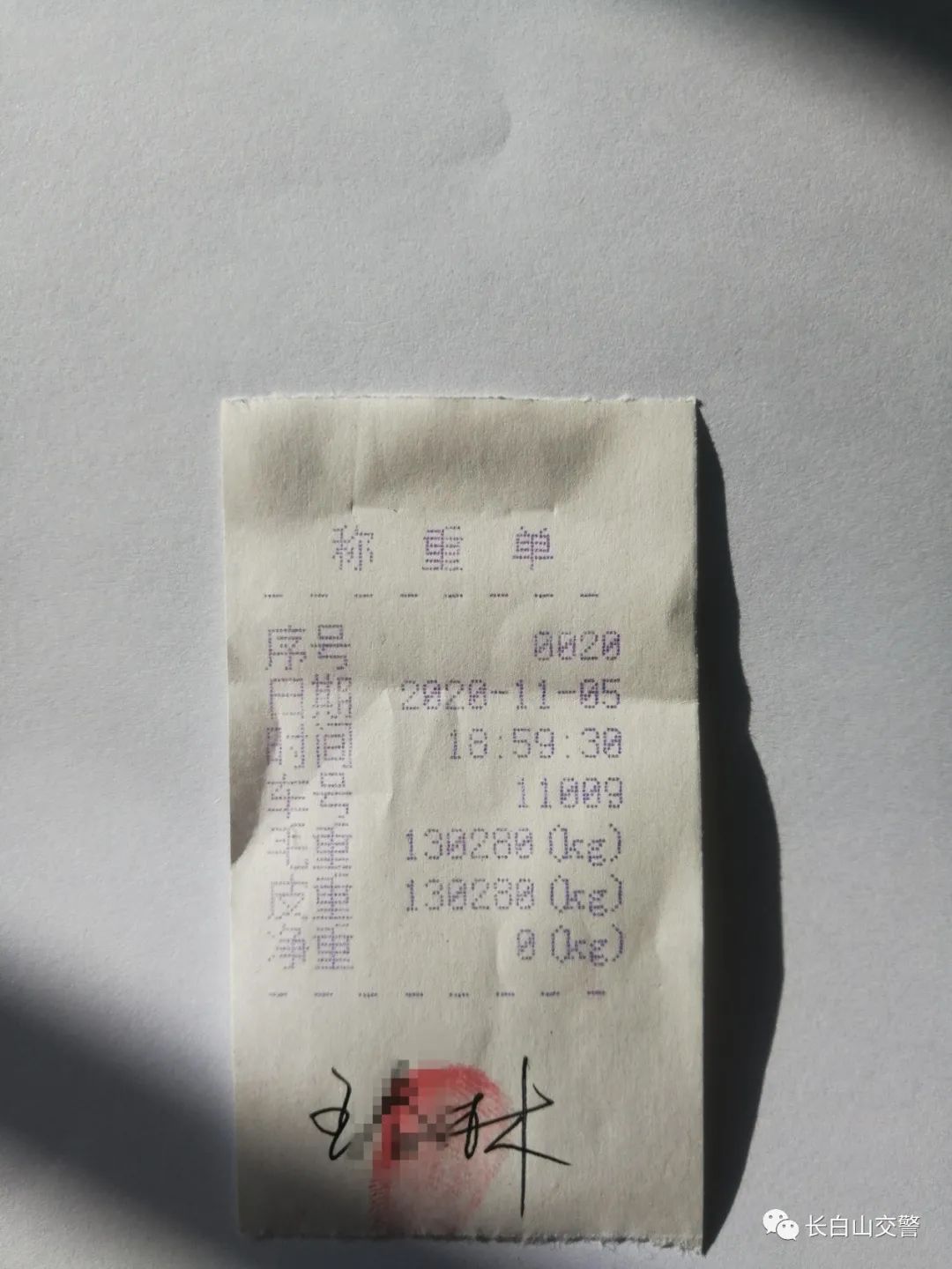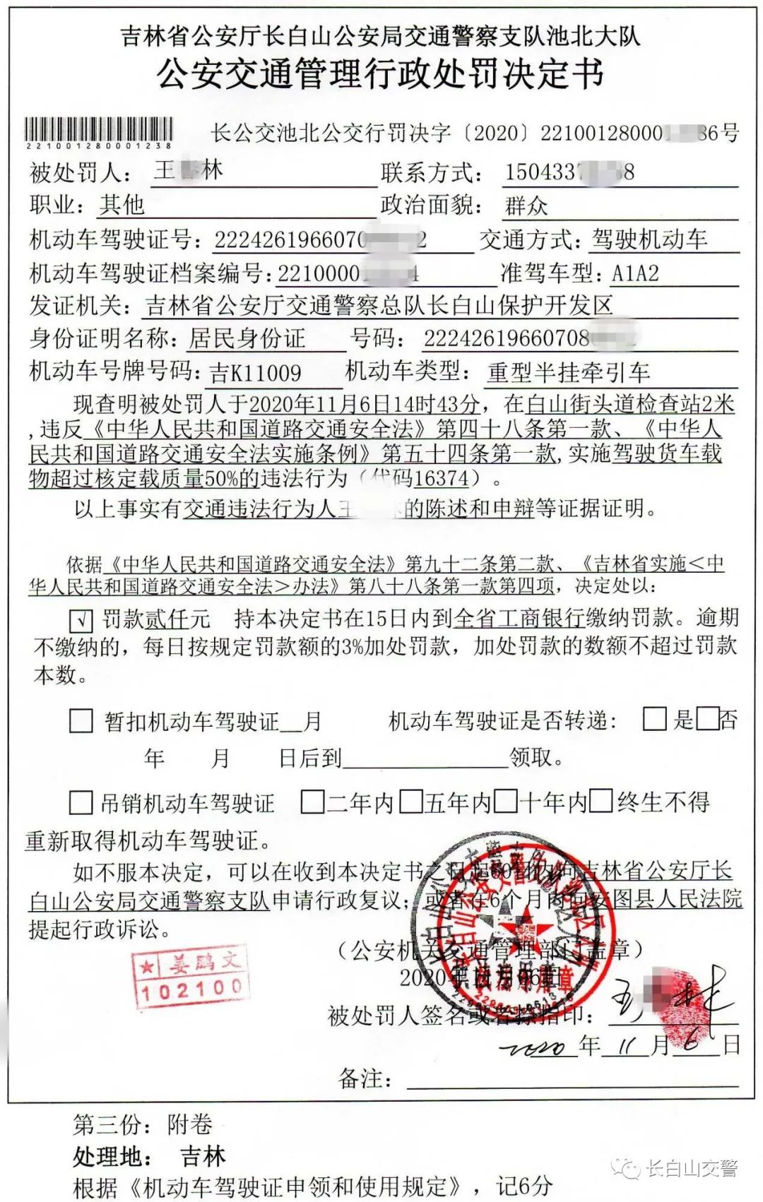 2020年11月06日14时43分,长白山池北交警大队查处“百吨王”一起。驾驶人王某林,驾驶车辆号牌为吉K11009的重型半挂牵引车,整车重130.28吨,给予其罚款2000元,记6分的处罚,并对其跟踪整改。