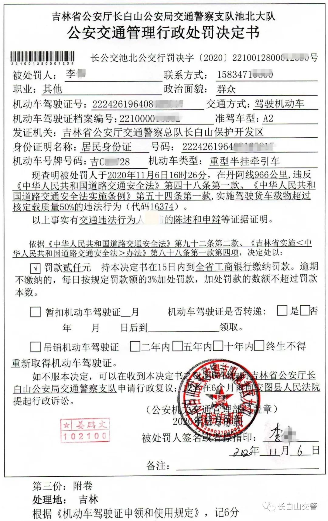 2020年11月06日16时26分,长白山池北交警大队查处“百吨王”一起。驾驶人李某,驾驶车辆号牌为吉C3B728的重型半挂牵引车,整车重125.56吨,给予其罚款2000元,记6分的处罚,并对其跟踪整改。