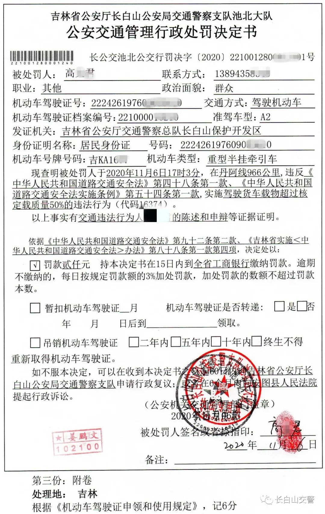 2020年11月06日17时03分,长白山池北交警大队查处“百吨王”一起。驾驶人高某君,驾驶车辆号牌为吉KA1677的重型半挂牵引车,整车重121.04吨,给予其罚款2000元,记6分的处罚,并对其跟踪整改。