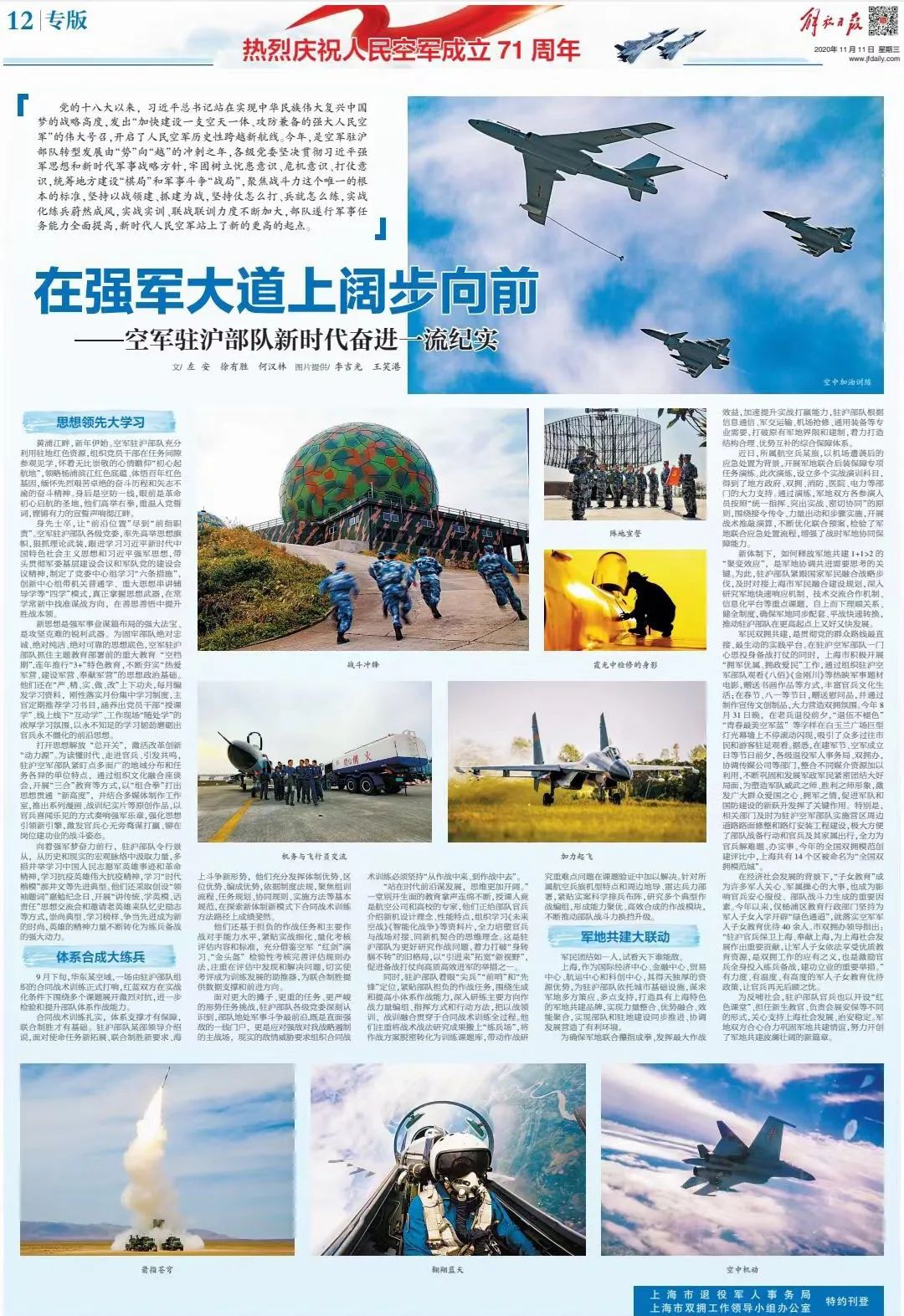 今天,解放日报刊发题为《在强军大道上阔步前行——空军驻沪部队新时代奋进一流纪实》的报道,让我们一起看看都有哪些精彩内容。
