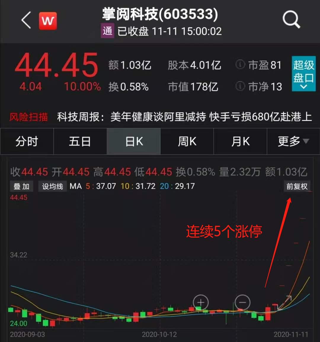 截至11日,掌阅科技已经连续拉出5个一字涨停,股价上涨超60%,总市值上涨近80亿。