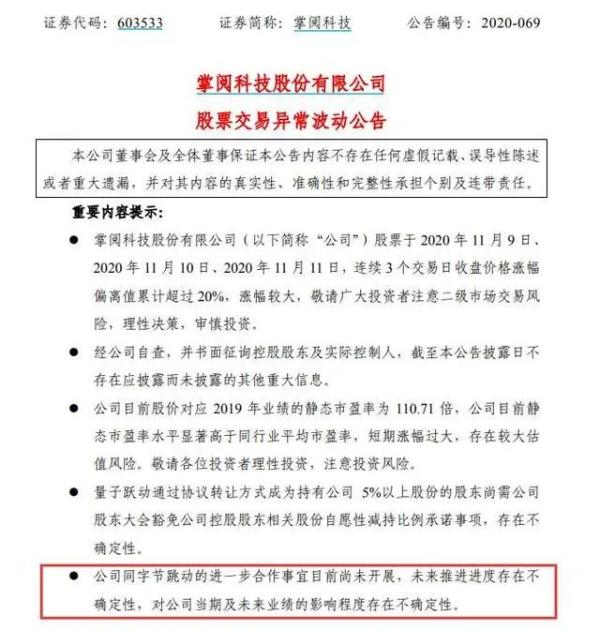 上交所分别在11月7日和11月11日向掌阅科技下发了问询函。掌阅科技也很快回复了,两次回复的内容都差不多,大致意思是:公司同字节跳动的进一步合作事宜目前尚未开展,未来推进进度存在不确定性,对公司当期及未来业绩的影响程度存在不确定性。