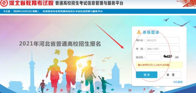 根据《2021年河北省普通高校招生考试报名须知》,11月11日8时至11月15日17时期间,通过报名资格初审的考生登录河北省教育考试院“普通高校招生考试信息管理与服务平台”(https://gk.hebeea.edu.cn,或通过河北省教育考试院官网http://www.hebeea.edu.cn右侧导航栏的“普通高考信息服务”进入),进行网上申报。考生首次登录须修改初始密码(为身份证号后八位),登录密码用于报名系统登录、报名信息查看、成绩查询、志愿填报、录取结果查询等。考生设置的密码要有一定强度,不要过于简单。考生要牢记登录密码并妥善保管。因考生个人保管不善造成的一切问题,责任由考生自负。遗忘密码的考生通过登录页面的“密码重置”链接,查看密码重置办法。