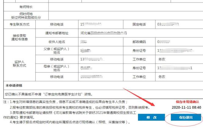 12.浏览填写的信息,确认无误后,点击“保存退出”。完成本次高考网上填报。