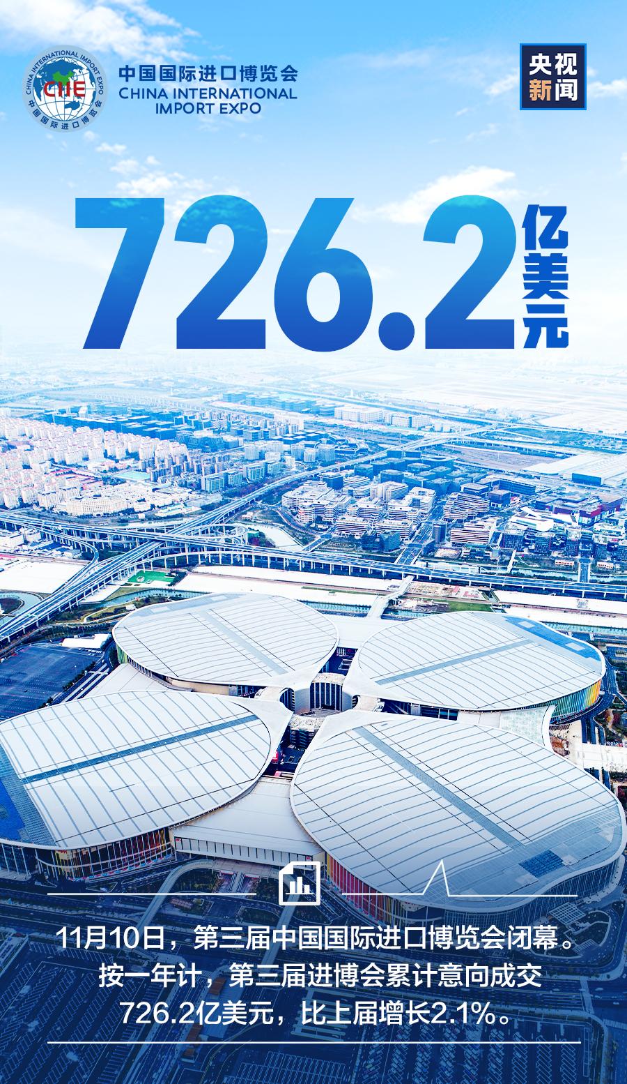 ▶第三届中国国际进口博览会10日闭幕 进博会期间,2000多家参展商和采购商达成合作意向861项,按一年计,累计意向成交726.2亿美元,比上届增长2.1%。