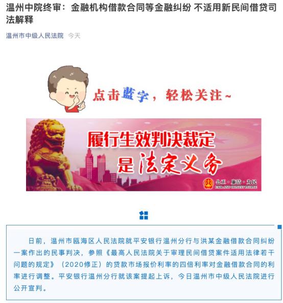 在11月12日的公告中,温州中院二审判决认为,“本案系金融借款纠纷,根据新民间借贷司法解释第一条第二款的规定,经金融监管部门批准设立的从事贷款业务的金融机构及其分支机构,因发放贷款等相关金融业务引发的纠纷,不适用该司法解释。故一审判决将本案金融借款合同中约定的利息、复利和逾期利息参照上述司法解释的规定按一年期贷款市场报价利率四倍进行调整,属适用法律错误,应予纠正。”第二个原因在于受理时间,温州中院在公告中称,“在本案一审受理时,新民间借贷司法解释尚未实施,该司法解释亦依法不适用于本案。”