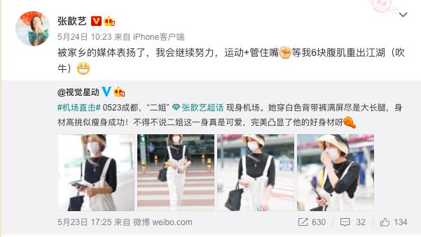 综艺节目结束,她的减肥之旅也没有结束。打开二姐的微博,我们可以看到: