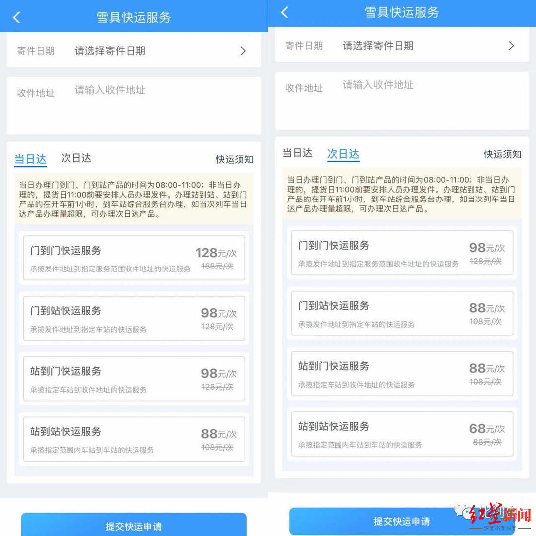 红星新闻记者注意到,雪具快运服务可选择当日达与次日达,有门到门、门到站、站到门、站到站四种快运服务,其中价格偏高的是门到门,指承揽发件地址到指定服务范围收件地址的快运服务,价格为128元每次;最便宜的是站到站,指揽指定范围内车站到车站的快运服务,价格为88元每次。