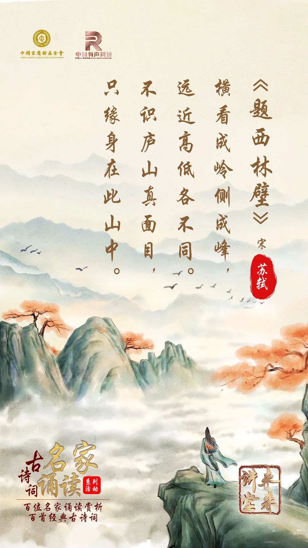 中国宋庆龄基金会、中国广播电视社会组织联合会有声阅读委员会携手推出“未来讲堂”古诗词名家诵读系列活动,邀请百位名家诵读赏析百首经典古诗词,把最经典的古诗词与最优美的声音有机结合,让广大青少年感受古诗词的力量与芬芳,在吟诵鉴赏中志存高远、陶冶情操。让我们传承经典,引领未来!今天,由优秀播音员姚迪老师为大家诵读和赏析的是北宋著名诗人苏轼的作品《题西林壁》。