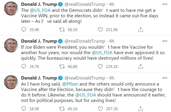 很快又发了一条:“如果拜登是总统,你们在接下来的4年里都不会有疫苗,FDA也不会那么快批准。官僚主义会毁掉数百万人的生命! ”
