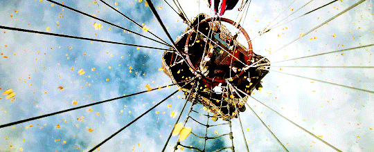 起飞之后她从热气球的篮子里爬出来,爬到气球顶端。